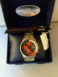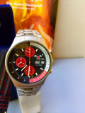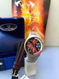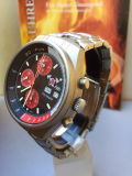 - Zifferblatt : Schwarz mit Roten Hilfszifferblätter, Datums und Wochentag Anzeige bei 3 Uhr. Bei 6 Uhr ist die 12 Stunden Anzeige und bei 12 Uhr die 24 Stunden Anzeige. Stunden und Minutenzeiger sind mit Leuchtmasse belegt.