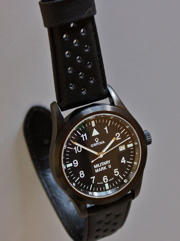Schwarz, arabische Zahlen mit vier Tritium Leuchtindexe, Stahl- Zeiger mit eingelegter Tritium Leuchtmasse
